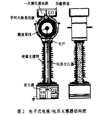 電流互感器設備由電流檢測單元和電壓檢測單元兩部分組成。前者選用羅柯夫斯基線圈作為電流傳感器,有源電子器件結(jié)束信號的數(shù)宇調(diào)制;后者選用電容分壓器作為電壓傳感器。高壓端電子線路電源由一個輔助電源感應線圈直接從母線上獲取。羅氏線圈和電源感應線圈安裝在母線上。高壓端信號調(diào)制和電源調(diào)度電路板置于·一個鐵磁屏蔽盒中,電流信號在高壓端經(jīng)AD轉(zhuǎn)化、E/O轉(zhuǎn)化后調(diào)制成光信號,經(jīng)過光纖傳送到低電位端。依據(jù)需求,可以將信號繼續(xù)用光纖傳送到遠方的控制室,也可以就地經(jīng)O/E、D/A轉(zhuǎn)化,放大成仿照電流信號,母線電壓經(jīng)電容分壓器轉(zhuǎn)化成低壓信號后,調(diào)制成光信號,經(jīng)光纖傳送到控制室,也可以就地經(jīng)校準、溫度補償后,給出仿照電壓信號、一個陶瓷套管既用作高壓部分元件的絕緣支撐,一起又是傳輸電流信號的光纖和電容分壓器的通道。